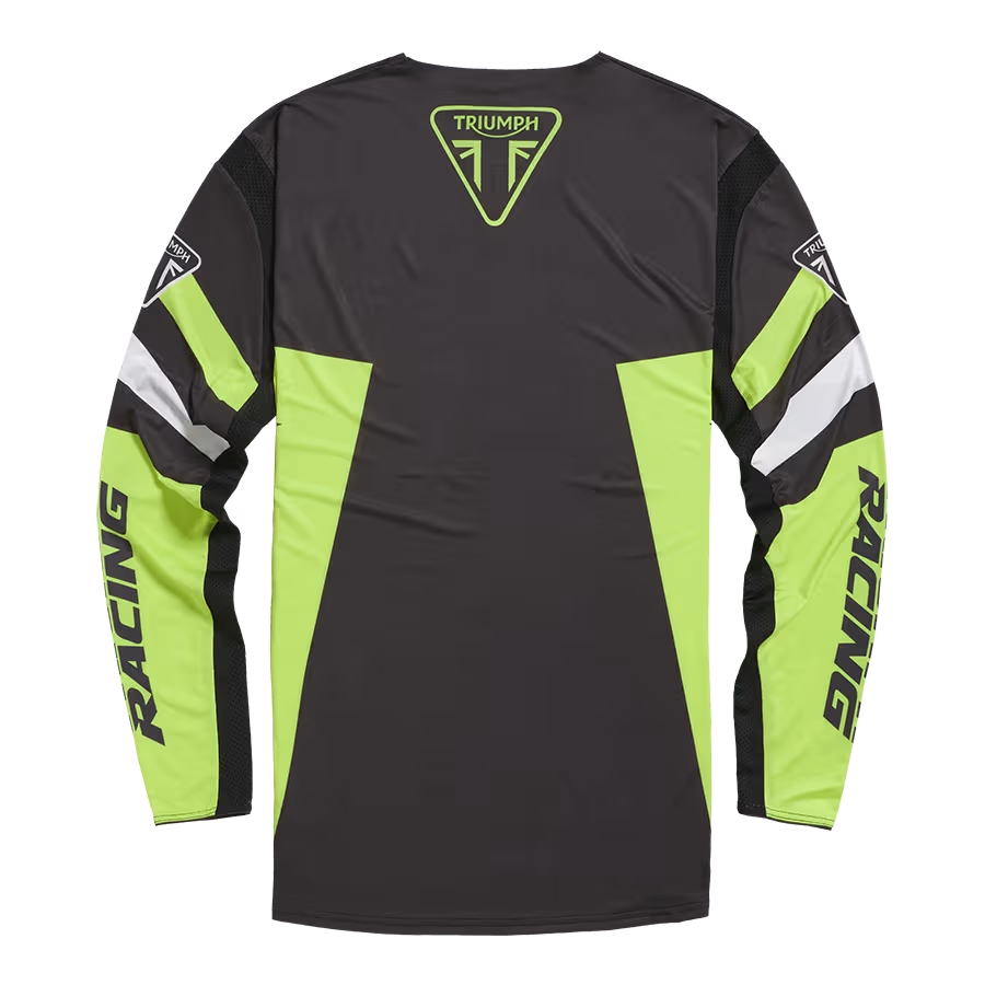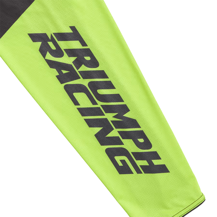 Lichtgewicht off-road jersey voor maximale bewegingsvrijheid, gemaakt van ultralicht polyester/elastaan en uitgevoerd in opvallend geel-zwart met Triumph Racing-graphics. Ruim vallende pasvorm, ideaal om over body armour te dragen.