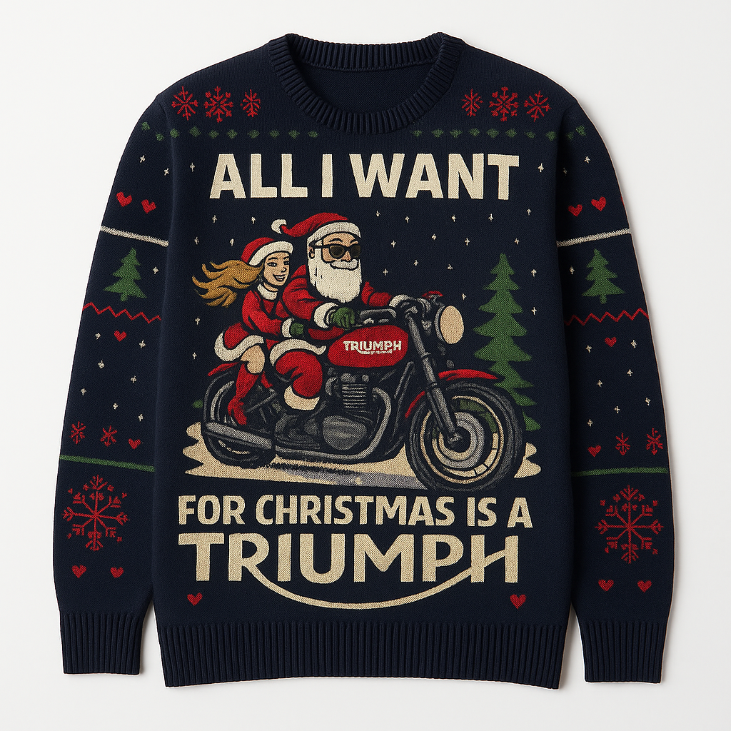 Vier deze feestdagen in stijl met de exclusieve Blom x Triumph Christmas Sweater. Deze warme, gebreide trui is een echte must-have voor elke Triumph-rijder of fan. De opvallende quote “All I want for Christmas is a Triumph” maakt hem helemaal af. Perfect om je trots voor het merk Triumph ook tijdens de feestdagen te laten zien. Reserveer hem nu en ontvang de trui eind november / begin december in huis.