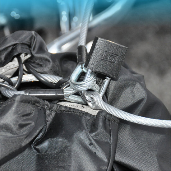 In de tas kan 1 helm en wat kleine accessoires zoals een zonnebril. Het lange slot kan om het voorwiel door de lange stalen kabel. De stalen kabel zit ook door de gehele binnevoering van de tas waardoor de tas ook niet opgesneden kan worden. Dus zorgeloos je helm achterlaten bij je motor. Er zit een kleine tas bij om de tas onderweg ook gemakkelijk te kunnen meenemen.