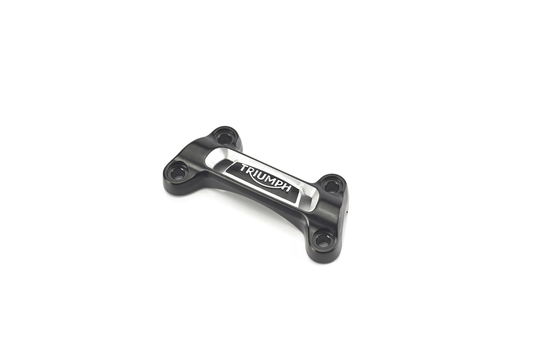 Door CNC-bewerkingen gefabriceerde bovenste stuurstangklem, die kan worden gemonteerd in plaats van het originele onderdeel. Het is voorzien van het legendarische Triumph-logo en heeft een zwarte, geanodiseerde afwerking.