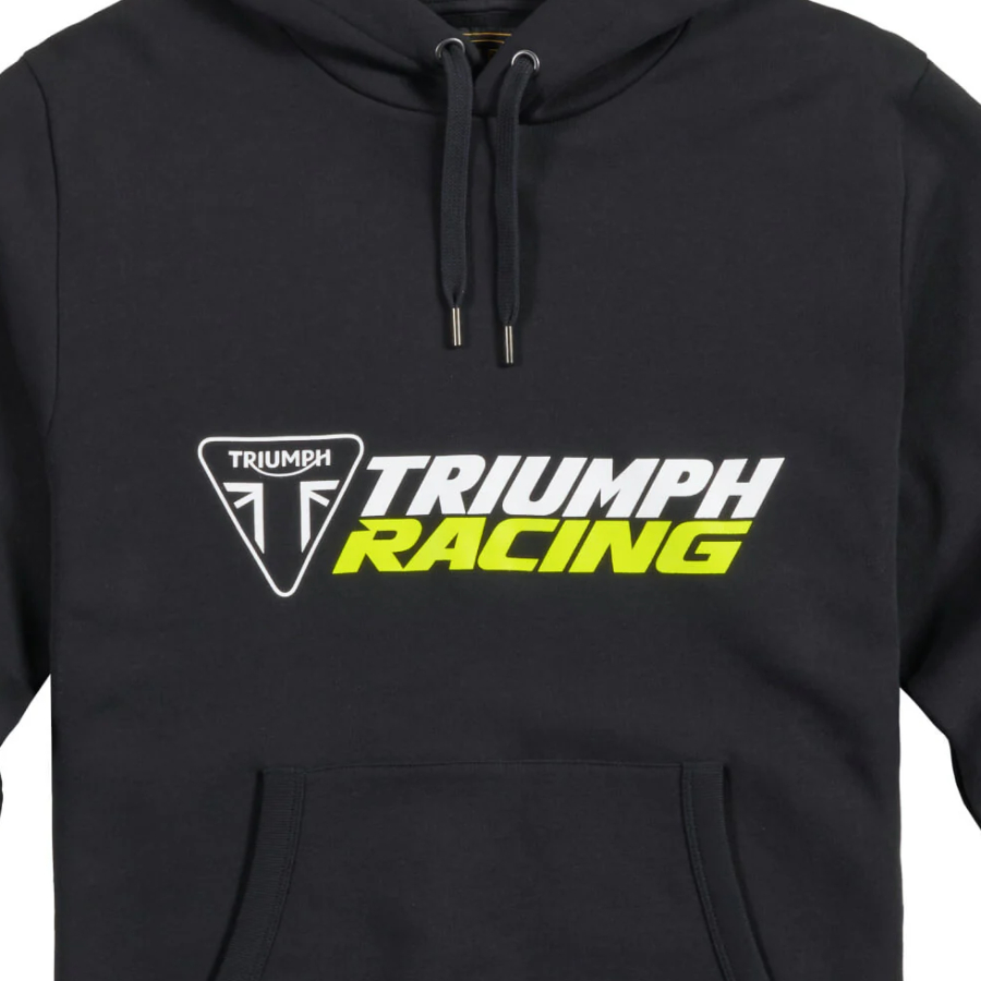 Sportieve full-zip hoodie in een premium katoenmix, uitgevoerd in strak zwart met bold Triumph Racing-branding voor een moderne, race-geïnspireerde look en dagelijks draagcomfort.