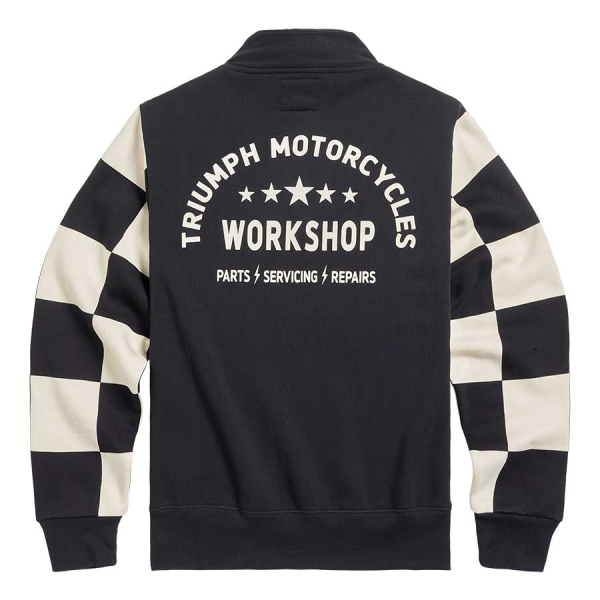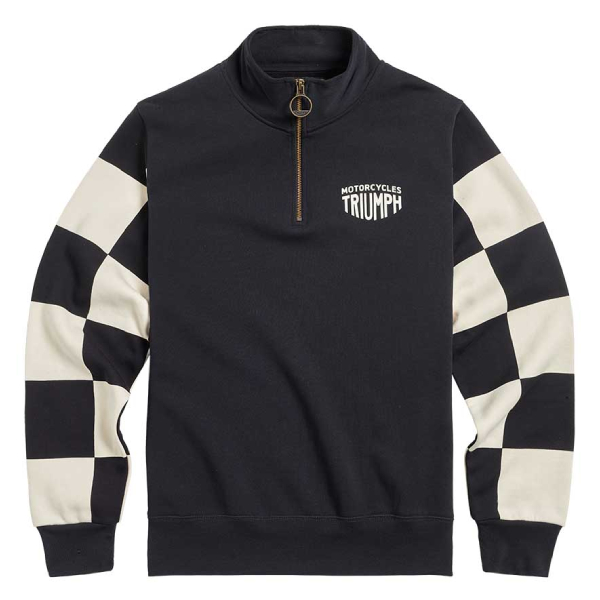 De Triumph Prewitt 1/4 Zip Sweat – Black/Bone combineert klassiek motorerfgoed met moderne stijl. Gemaakt van zwaar fleece-back katoen met opvallende checkerboard-mouwen en een subtiel Triumph-logo voor een onderscheidende, sportieve look.