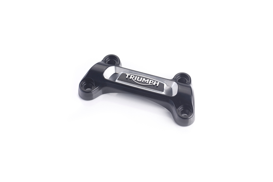 Door CNC-bewerkingen gefabriceerde bovenste stuurstangklem, die kan worden gemonteerd in plaats van het originele onderdeel. Het is voorzien van het legendarische Triumph-logo en heeft een zwarte, geanodiseerde afwerking.